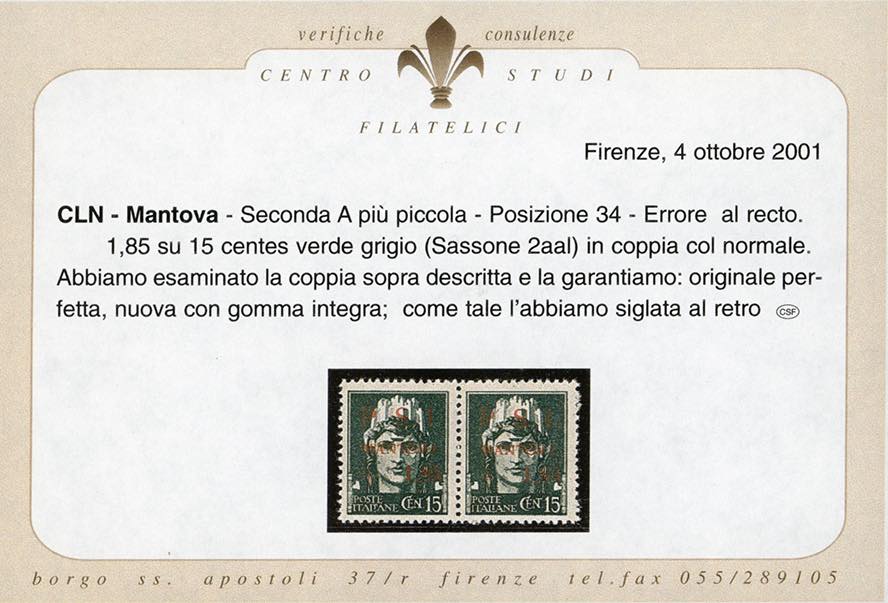 MANTOVA 1945 - 1,85 lire su 15 cent., soprastampa recto-verso, al recto seconda "A" di "MANTOVA" tagliata in alto, in coppia con il normale (2aal,2aa), gomma originale integra, perfetta. Cert. Centro Studi Filatelici Firenze.