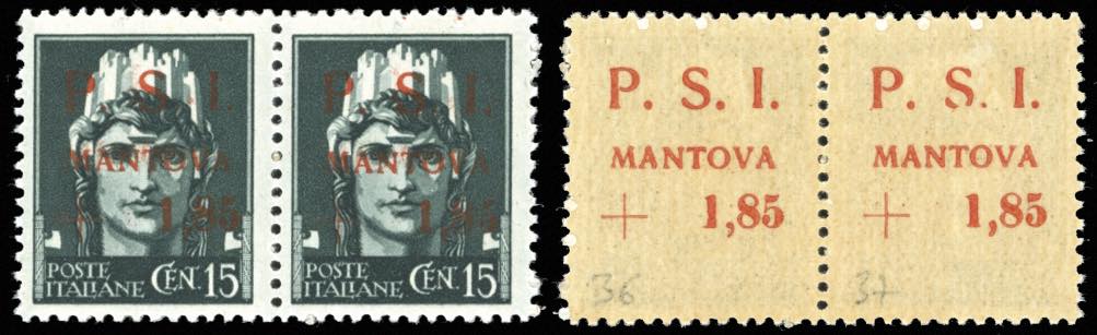 MANTOVA 1945 - 1,85 lire su 15 cent., soprastampa recto-verso, al recto seconda "A" di "MANTOVA" tagliata in alto, in coppia con il normale ... Read more