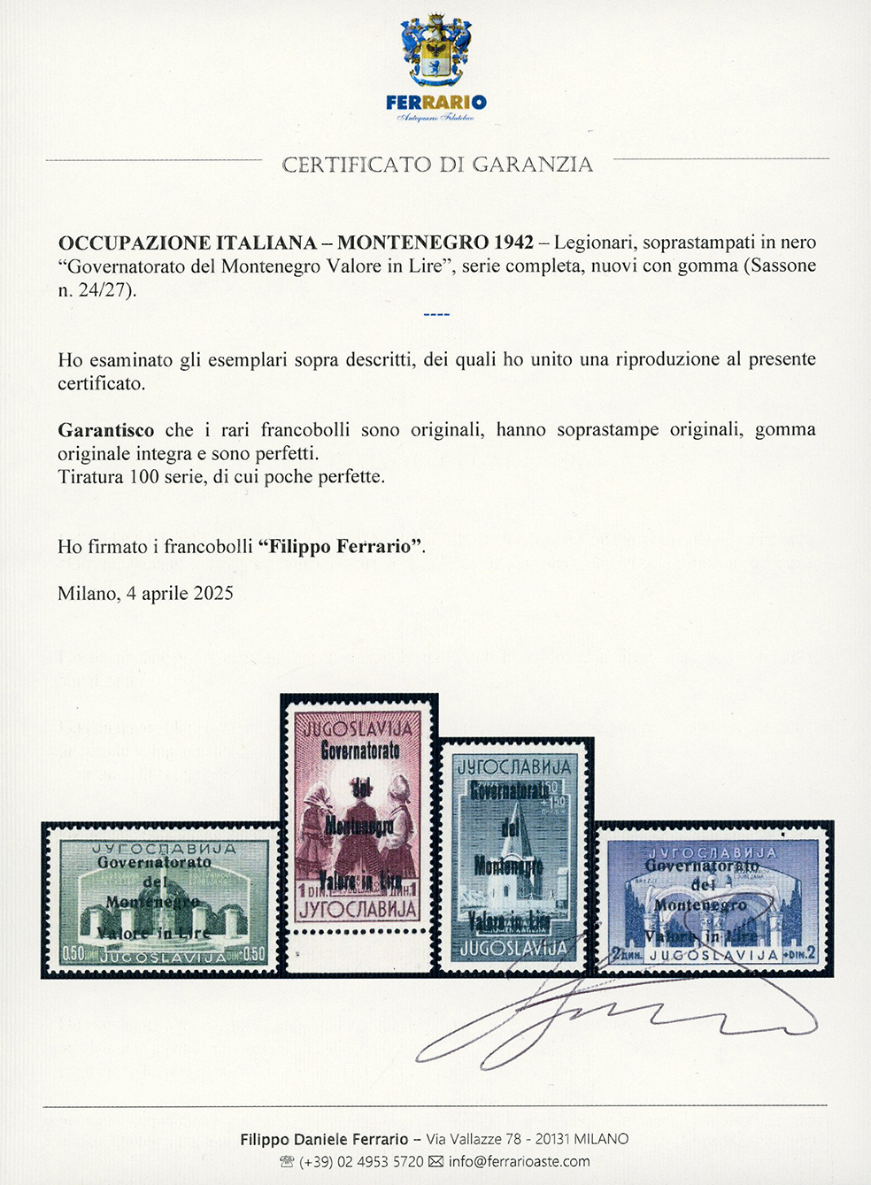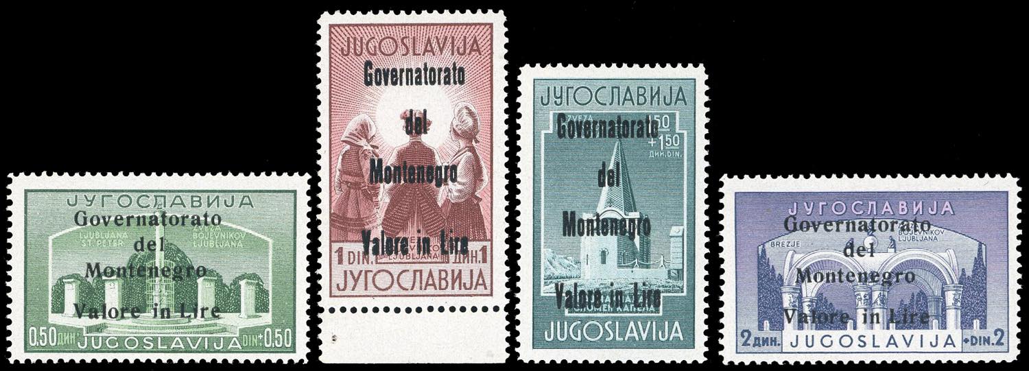 MONTENEGRO 1942 - Legionari, soprastampati in nero, serie completa (24/27), nuovi, gomma originale integra, perfetti e di ottima qualità. Rari, tiratura 100 serie, di cui parecchie difettose. A.Diena, cert. Ferrario e Diena.