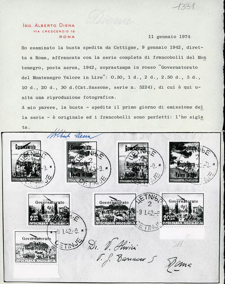 MONTENEGRO POSTA AEREA 1942 - Soprastampati "Governatorato del Montenegro" in rosso, serie completa (18/25), perfetti, su busta da Cettigne 9/1/1942, primo giorno d'emissione, a Roma, bollo d'arrivo al verso. Rara, tiratura 500 serie, ottima qualità. Ferrario, cert. A.Diena.