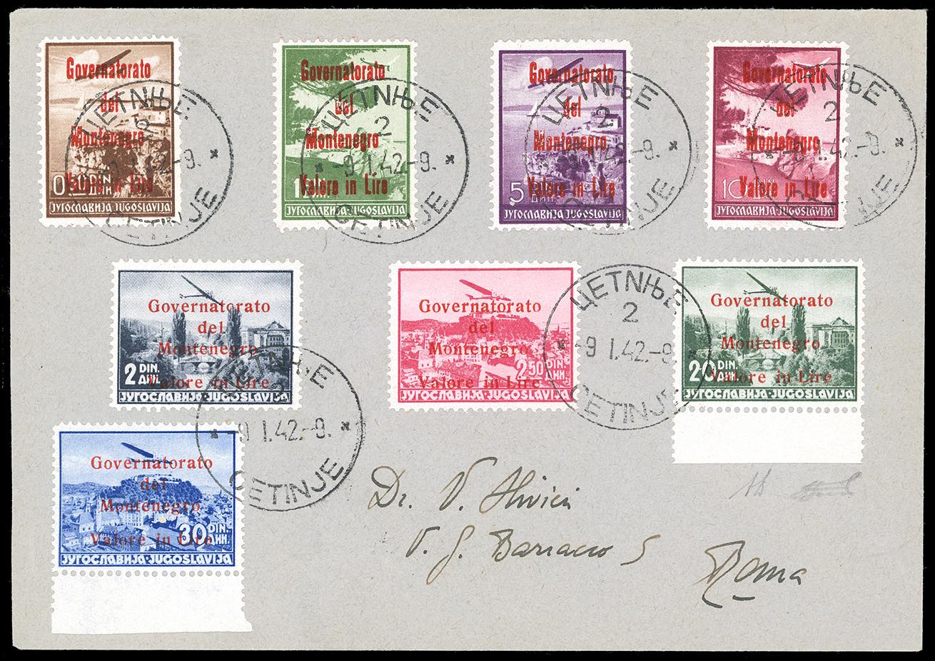 MONTENEGRO POSTA AEREA 1942 - Soprastampati "Governatorato del Montenegro" in rosso, serie completa (18/25), perfetti, su busta da Cettigne ... Read more