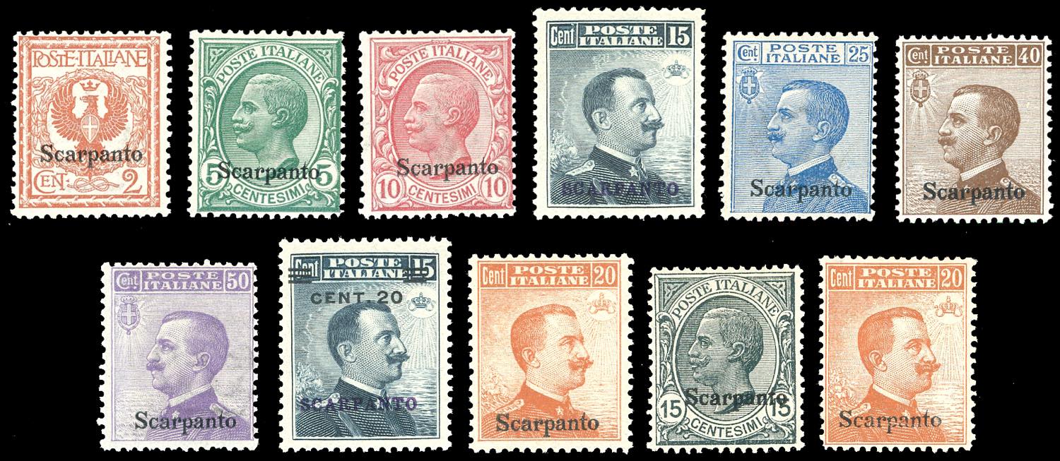 SCARPATO 1912/22 - Soprastampati, le prime quattro emissioni (1/7,8,9,10/11), nuovi, gomma originale integra, leggera traccia di linguella per i n. 1,3,10 e 11, perfetti.