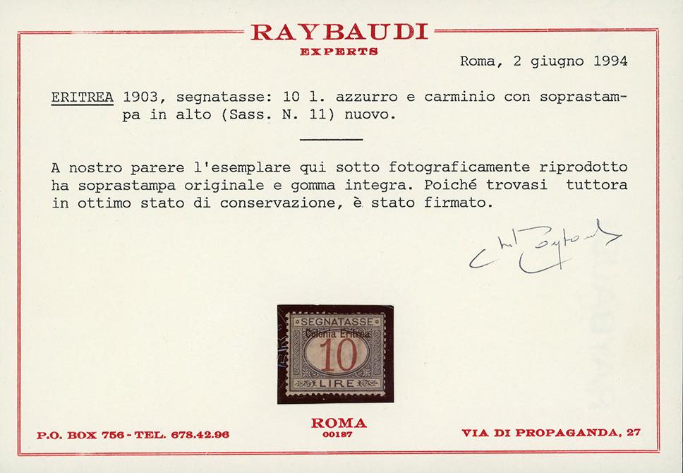 SEGNATASSE 1903 - 10 lire soprastampato in alto (11), nuovo, gomma originale integra, perfetto. Raro. G.Oliva, Fiecchi, cert. Raybaudi.