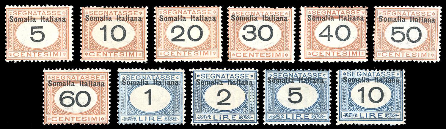 SEGNATASSE 1926 - Cifre nere, moneta italiana, serie completa (41/51), gomma originale integra, perfetti. Cert. Chiavarello per gli alti valori.