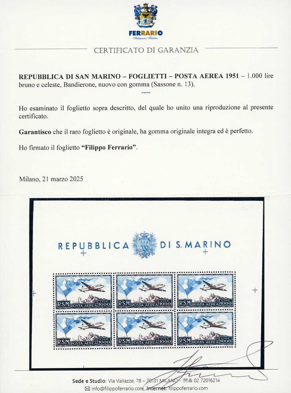 1951 - 1.000 lire Bandierone, foglietto (13), nuovo, gomma originale integra, perfetto. Raro e di ottima qualità. Avi, cert. Ferrario.