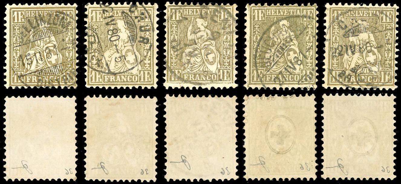 SVIZZERA 1862 - 1 fr. oro, Helvetia seduta (Unif.41), cinque esemplari usati, perfetti.