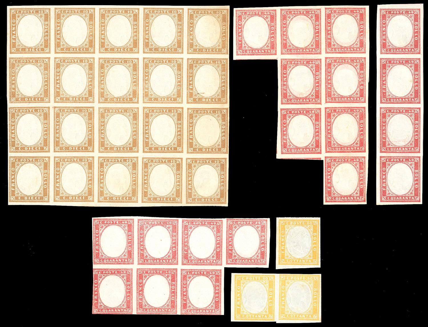 SARDEGNA 1863 - 10 cent., blocco di 20 esemplari, 40 cent., 19 esemplari in blocchi e strisce, 80 cent., 3 esemplari, IV emissione, tutti ... Read more