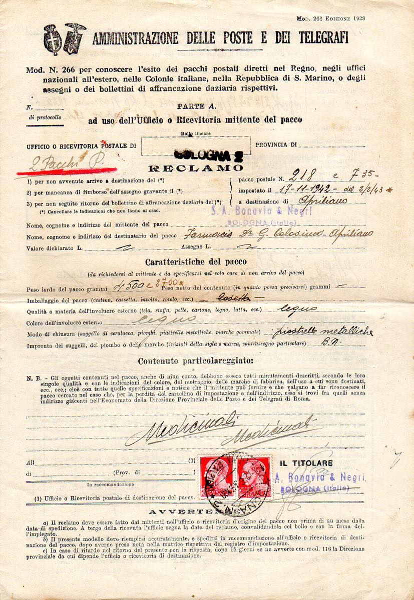Lot 2465 - REGNO D'ITALIA 1943 - Quattordici moduli di reclami ...