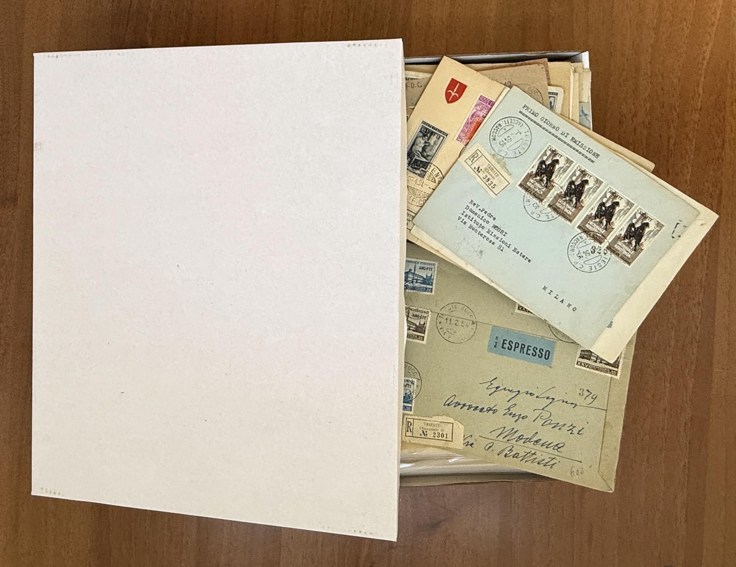 TRIESTE A AMG-FTT/AMG-VG 1945/1954 - Importante accumulazione commerciale di decine di buste affrancate con valori del periodo in una grande scatola. Notate molte lettere di pregio e anche di una certa rarità. Ottimo per dettaglio, alto valore.