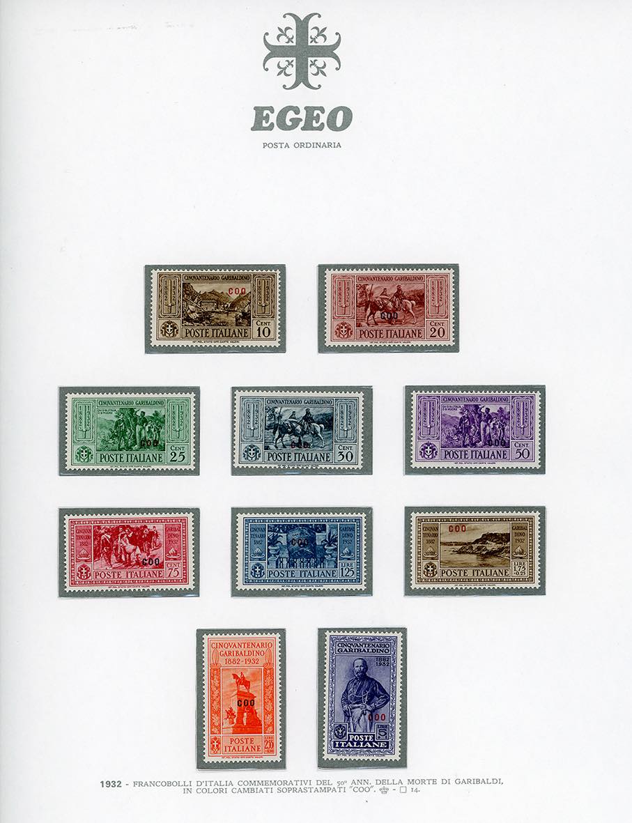 EGEO ISOLE 1932 - Garibaldi, giro completo delle 14 isole, compreso Castelrosso e la serie di posta aerea dell'Egeo, tutti gomma originale integra, perfetti, montati in fogli Bolaffi. Qualità eccellente.