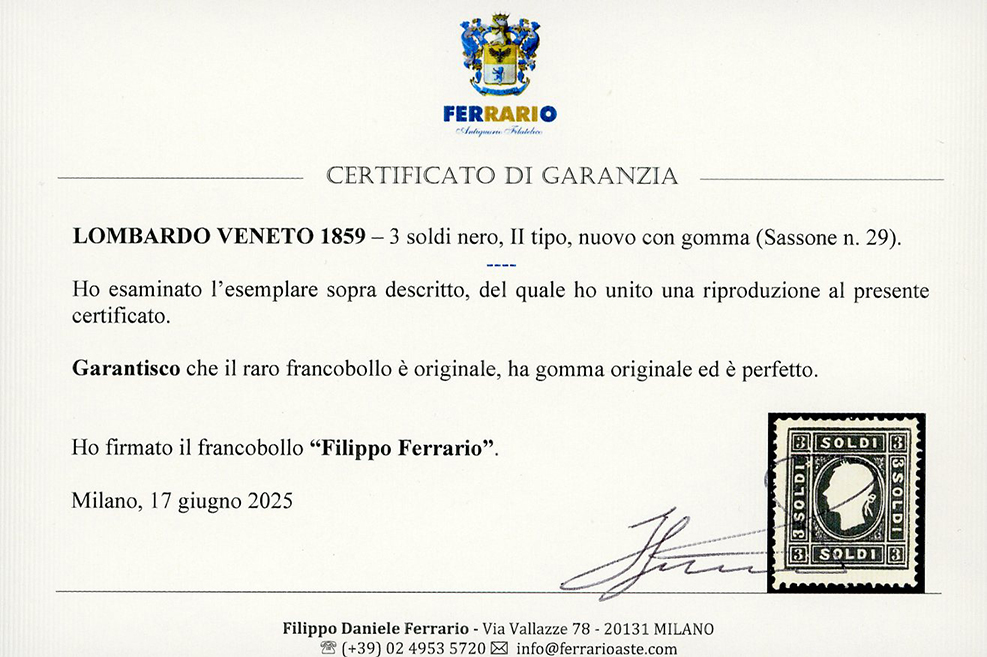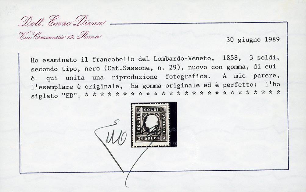 1859 - 3 soldi nero, II tipo (29), nuovo, gomma originale, leggera traccia di linguella, perfetto. Raro e di ottima qualità. Fiecchi, cert. E.Diena 1989 e Ferrario.