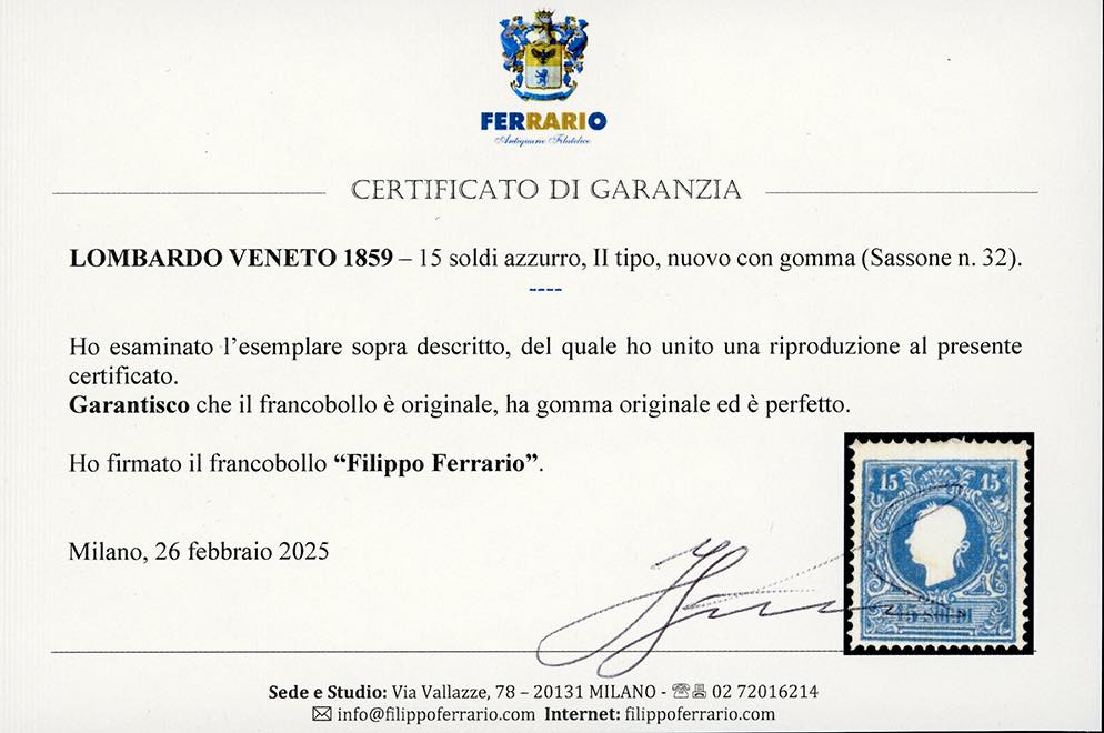 Lot 40 - 1859 - 15 soldi azzurro, II tipo (32), gomma originale, ...