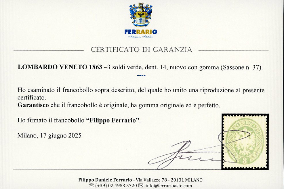 1863 - 3 soldi verde, dent. 14 (37), nuovo, gomma originale, perfetto e molto fresco. Raro. Cert. Ferrario.