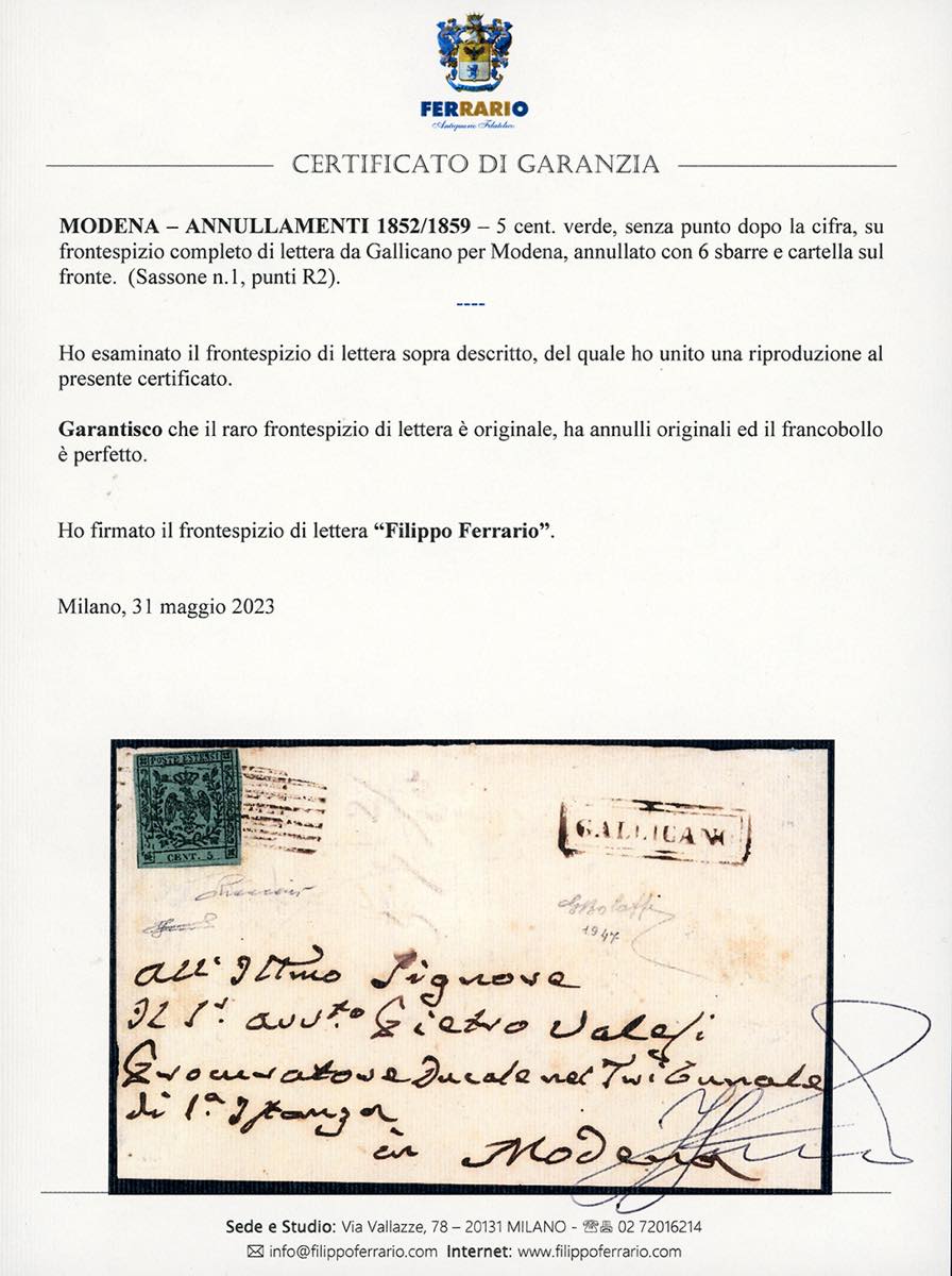 GALLICANO, 6 sbarre + cartella punti R2 - 5 cent. verde, senza punto dopo la cifra (1), perfetto, su fresco frontespizio completo di lettera per Modena. Annullo estremamente raro, pochissimi esemplari noti. G.Bolaffi, Vaccari, cert. Ferrario.