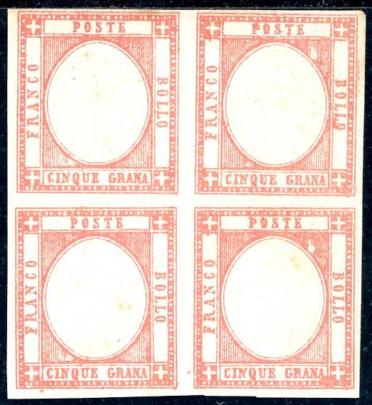 1861 - 5 grana vermiglio (21a), blocco di quattro, gomma originale integra per i due esemplari inferiori, uno dei quali con doppia effigie ... Read more