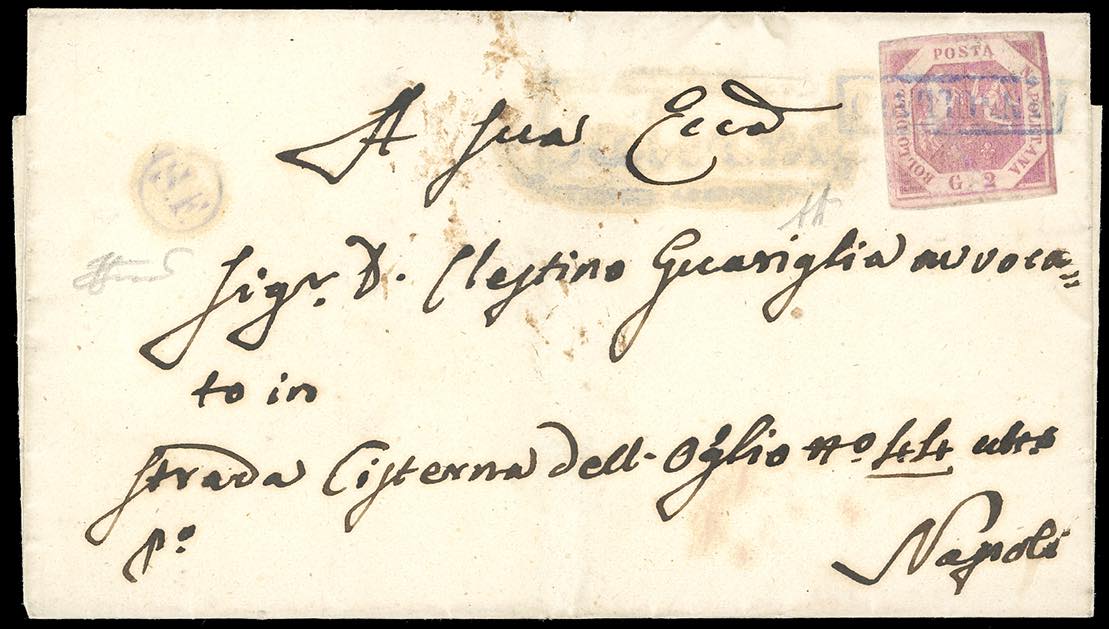 S.F., cerchio piccolo azzurro punti +11 - 2 grana (7), riparato, su lettera da Salerno, annullato + ovale in azzurro, a Napoli febbraio ... Read more