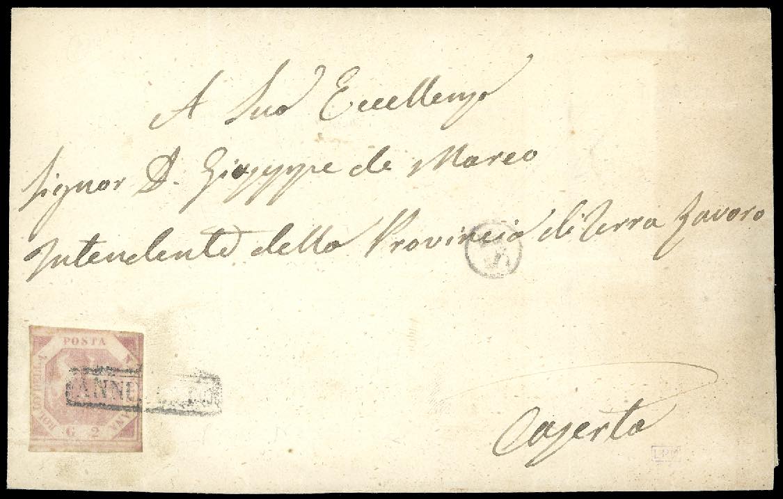 S.F., cerchio piccolo in nero, punti +8 - 2 grana (5), buono stato, su lettera da Napoli 20/3/1859 a Caserta. Rara.
