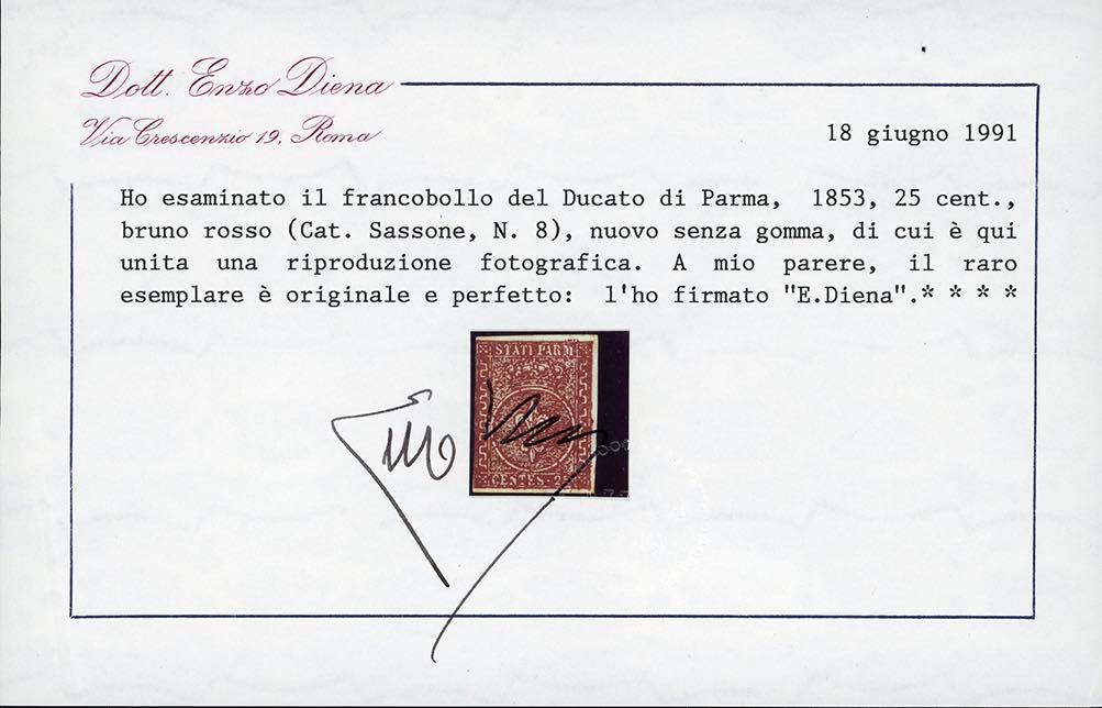 1855 - 25 cent. bruno rosso (8), nuovo senza gomma, tre ottimi margini, completo il sinistro, perfetto. Molto raro. Cert. Enzo Diena 1991.