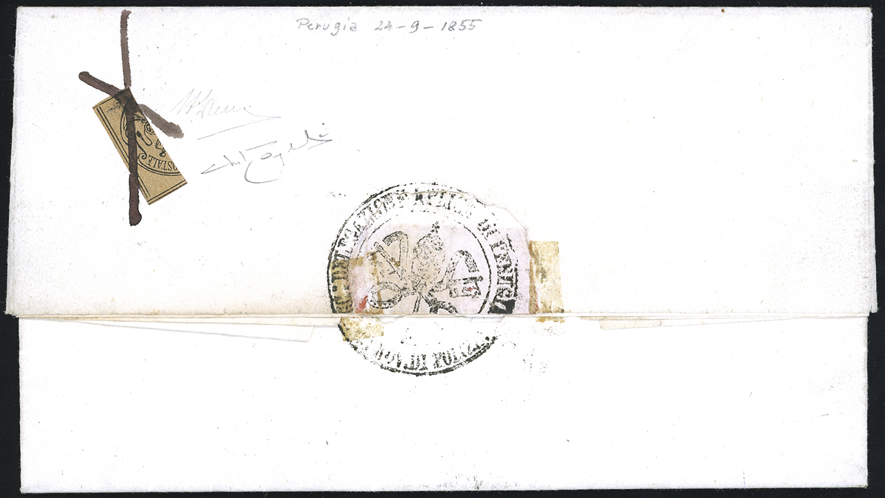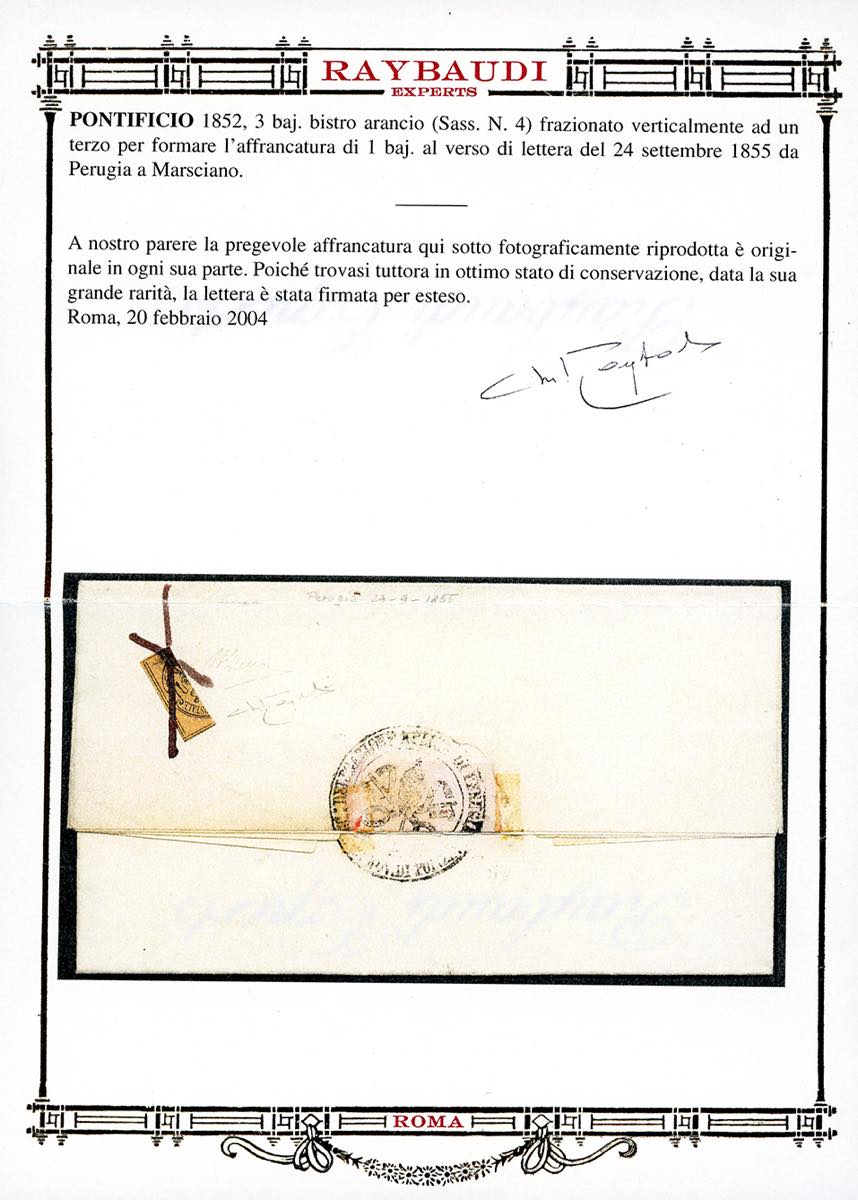 1855 - 3 baj bistro arancio (4), frazionato verticalmente ad 1/3, perfetto e ben marginato, annullato a penna al verso di fresca lettera in porto assegnato da Perugia 24/9/1855 a Marsciano. Molto bella! Cert. A.Diena e Oro Raybaudi.