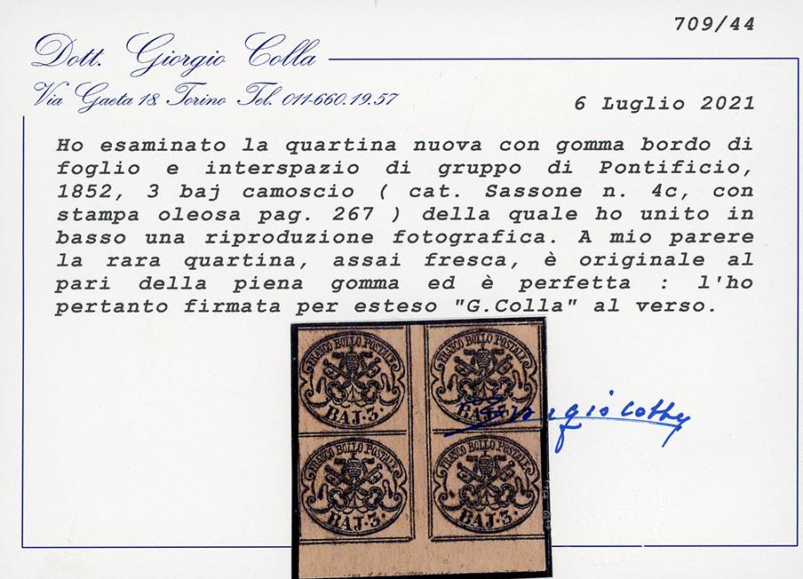1852 - 3 baj camoscio (4c), blocco di quattro, bordo di foglio inferiore, composto da due coppie orizzontali con interspazio di gruppo al centro, nuovo, gomma originale, integra per un esemplare, perfetta. Molto bella e rara. Cert. G.Colla.