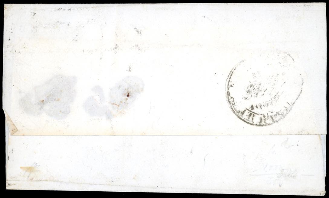 1858 - 3 baj giallo paglia (4d), striscia orizzontale di tre, piccolo bordo di foglio in alto, margine inferiore intaccato, su lettera da Roma, settembre 1858, a Nocera. Si tratta del massimo multiplo noto su busta di questo francobollo, una delle sole due lettere finora note. E.Diena, cert. Ferrario. Ex coll. Imperato.