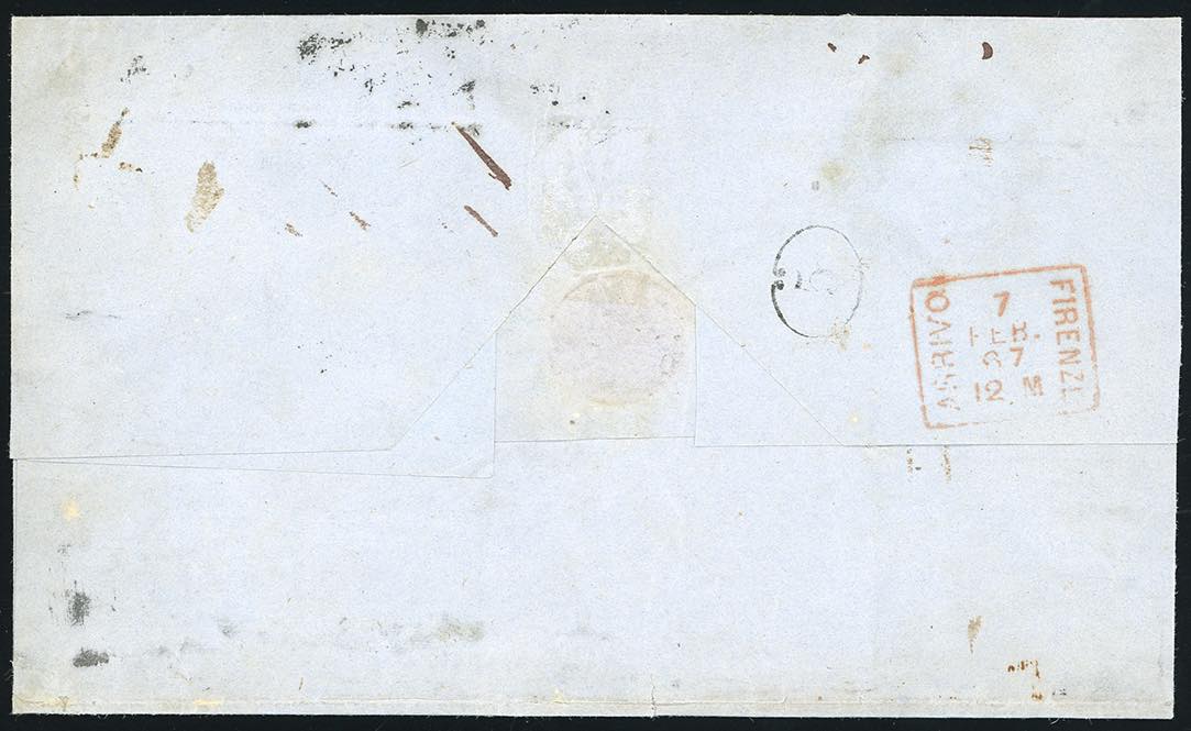 1867 - 3 baj giallo cromo (4A), quattro esemplari, perfetti, su lettera da Roma 6/2/1867 a Firenze, segno di tassa "2" cassato e corretto in "6", per la tariffa di terzo porto. Multiplo estremamente raro di queste tonalità. Chiavarello, cert. Ferrario. Ex coll. Imperato.