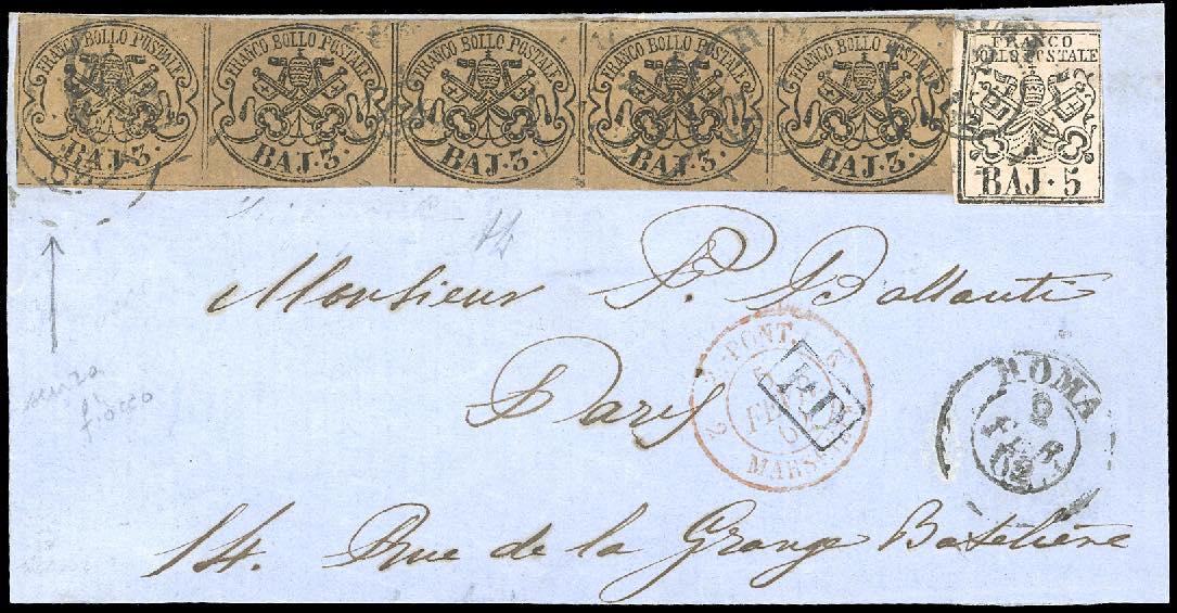1862 - 3 baj bruno, striscia orizzontale di cinque, il primo esemplare con bella ed evidente varietà di clichè, ottimo stato, 5 baj rosa chiaro (4Aa,6), su fresco frontespizio di lettera da Roma 2/2/1862 a Parigi, in Francia. Affrancatura molto rara, di ottimo aspetto. A.Diena (cat.Sassone €37.500+ come lettera).