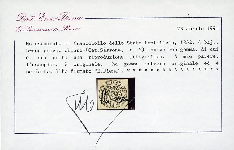 1852 - 4 baj bruno grigio chiaro (5), nuovo, gomma originale integra, perfetto e con i filetti completi sui quattro lati. Molto raro e di ottima qualità. Raybaudi, cert. Enzo Diena 1991 e Ferrario.