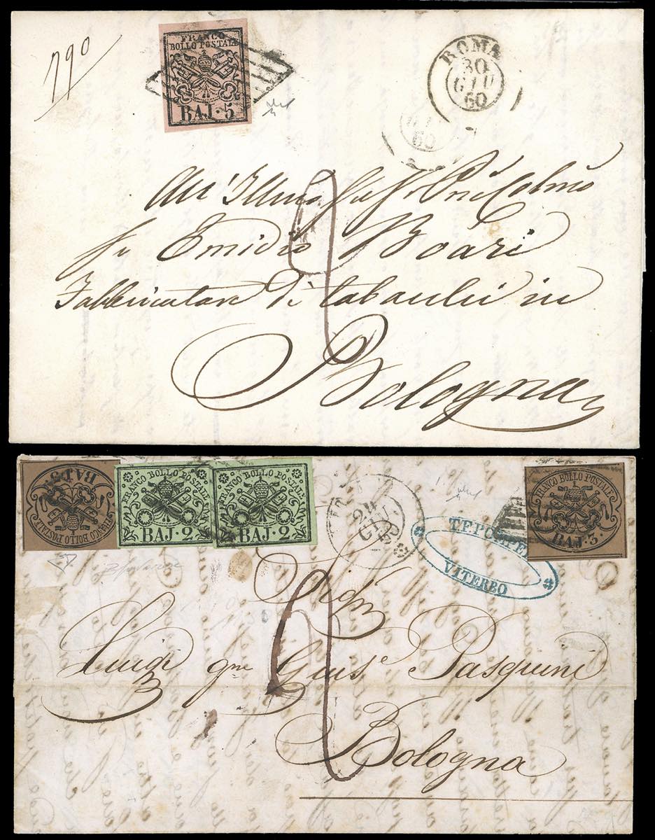 1860 - Due lettere indirizzate a Bologna e tassate 20 cent. come porto semplice, la prima affrancata con 5 baj rosa carminio (6A), perfetto, da Roma 30/6/1860, la seconda di doppio porto con 2 baj verde oliva e 3 baj bruno, entrambi due esemplari (3,4Aa), perfetti, da Viterbo 24/6/1860. Interessante insieme per lo studio dei diversi scaglioni di peso nei rapporti tra lo Stato Pontificio e il Regno Sardo-Italiano. Chiavarello la prima, E.Diena la seconda.