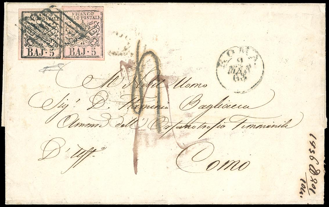 1863 - 5 baj rosa carminio e 5 baj rosa vinaceo (6A,6Aa), perfetti, su lettera da Roma 9/3/1863 a Como, tassata, al verso tre bolli di ambulanti differenti. Bella combinazione di valori gemelli. Ferrario.