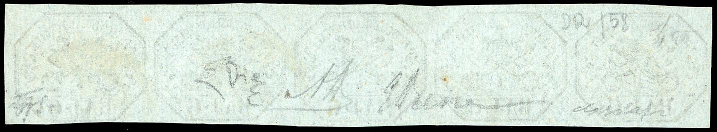1852 - 6 baj grigio azzurrastro (7b), striscia orizzontale di cinque, perfetta, usata con datario a doppio cerchio di Roma, splendida! G.Bolaffi, Em., A., ed E.Diena. Ex coll. Imperato.