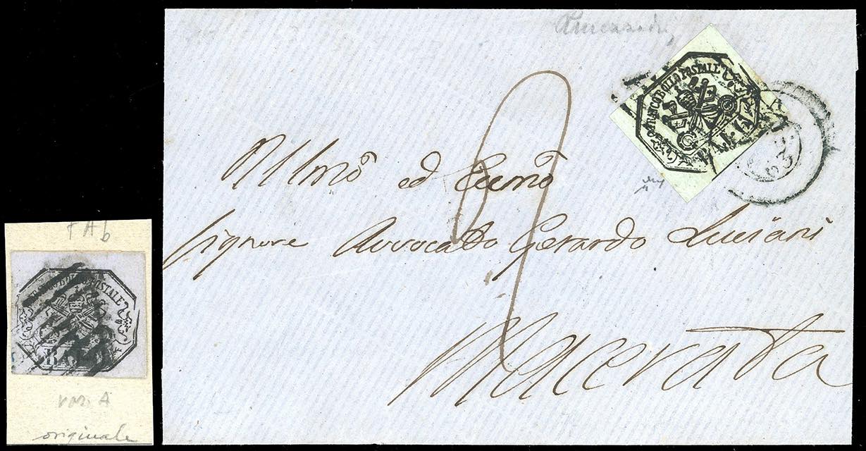 1863 - 6 baj, bella varietà di clichè a destra "A", un esemplare lilla grigio (7Ad/A), usato, ed uno grigio verdastro (7f/A), su busta da Roma 15/5/1863 a Macerata, tassata. Entrambi i francobolli sono perfetti. Non comune insieme. A.Diena il primo, Mezzadri e Chiavarello la busta.