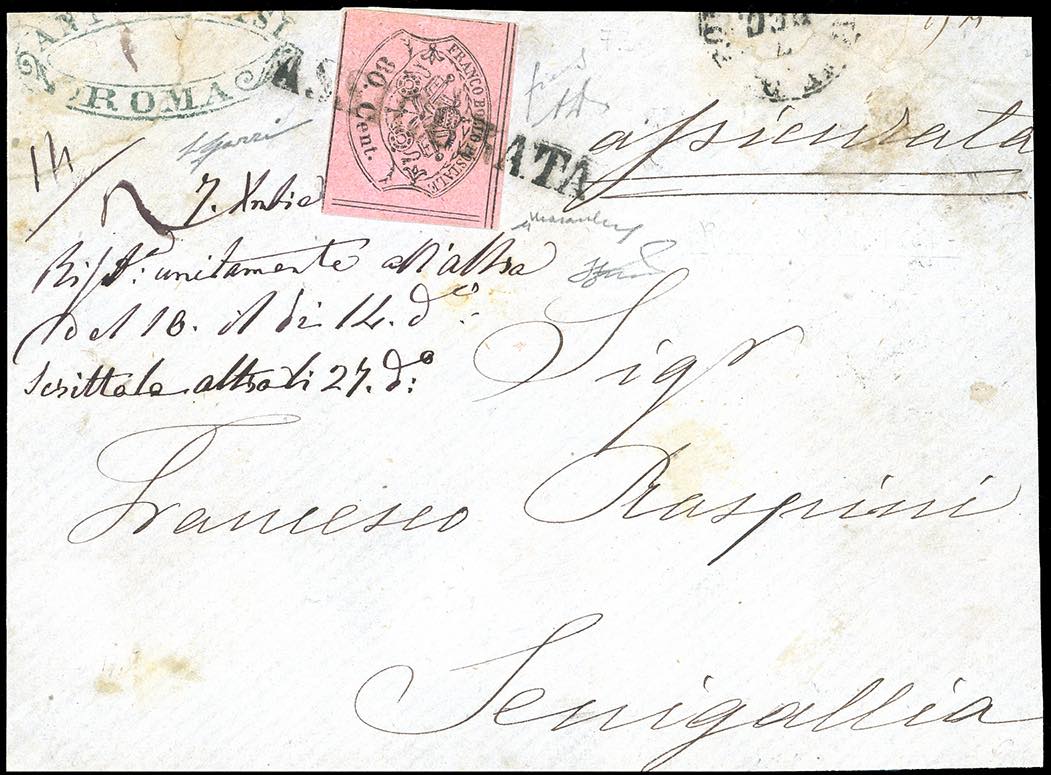 ROMA, assicurata III tipo, punti R1 - 80 cent. rosa lillaceo (20), perfetto e molto fresco, su gran parte di lettera assicurata, parzialmente incompleta al verso, del 7/12/1867 a Senigallia. Lineare annullatore molto raro, specie su questo valore. A.Diena, Fiecchi, Chiavarello, cert. Ferrario. Ex coll. Imperato.