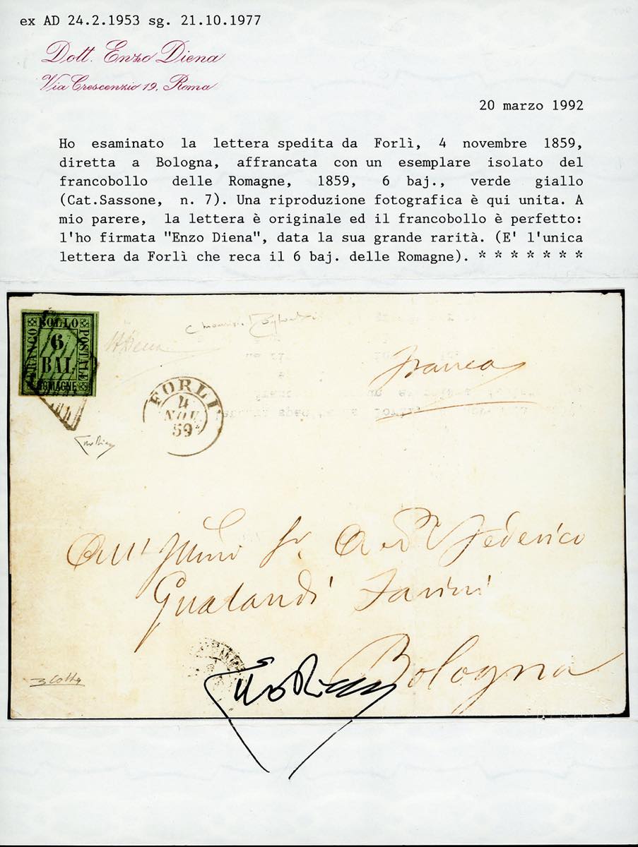 1859 - 6 baj verde giallo (7), perfetto e ben marginato, su lettera di doppio porto da Forlì 4/11/1859 a Bologna. Una delle due sole lettere note affrancate con il raro 6 baj inviate da Forlì. Rarità del Governo Provvisorio delle Romagne. Alberto Diena, Colla, Raybaudi, cert. Enzo Diena e Ferrario. Ex coll. Barcella.