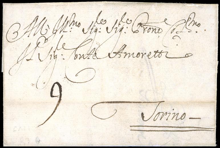 INCOMING MAIL SPAGNA 1703 - Lettera prefilatelica da Cadice 25/8/1703 a Torino, con segno di tassa sul fronte. Non comune e molto bella. Ex coll. Hess.