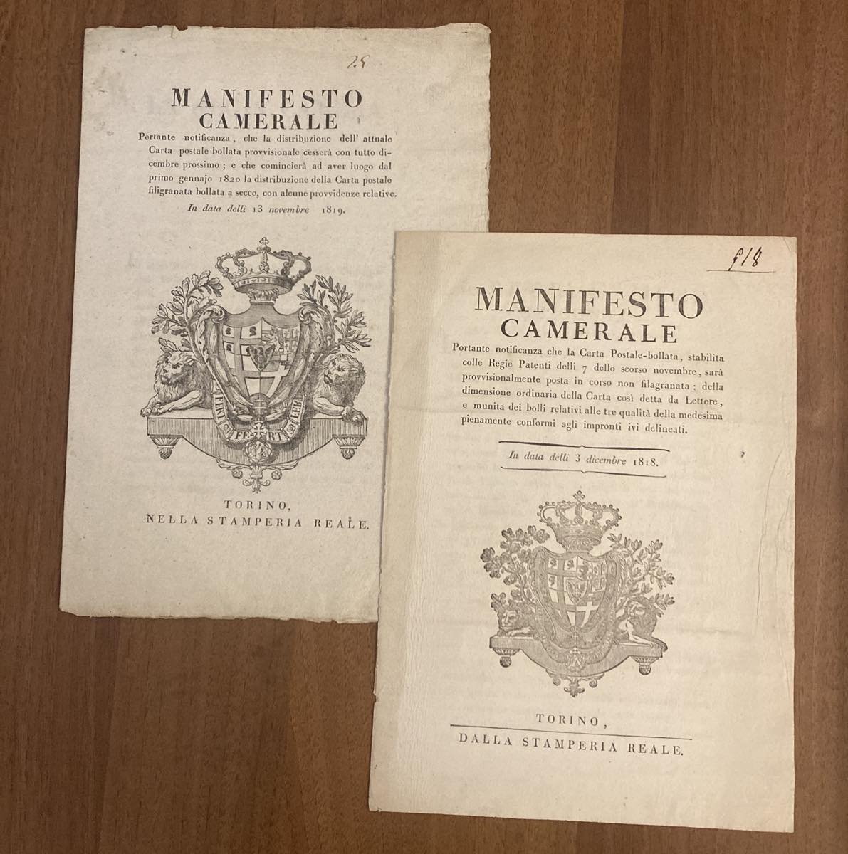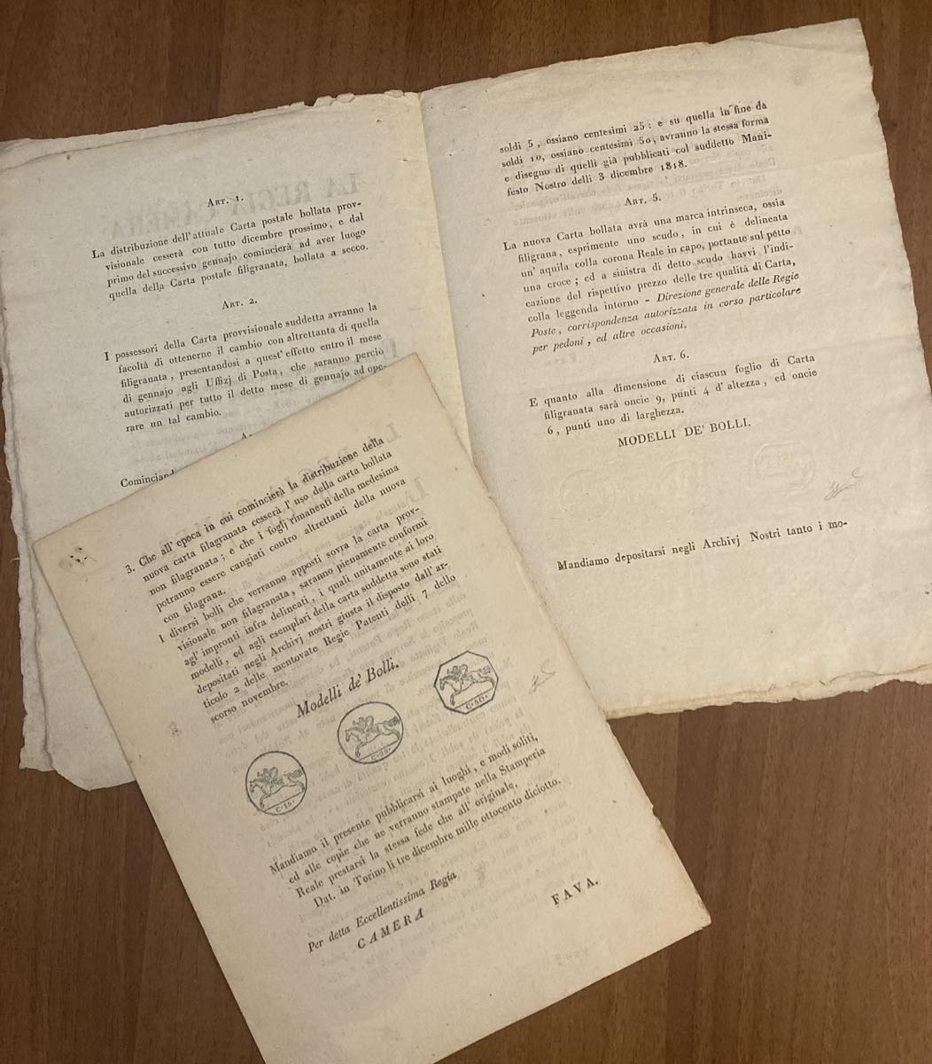 1818/19 - I due Manifesti camerali contenenti l'annuncio dell'emissione dei Cavallini, con le indicazioni delle loro caratteristiche e delle modalità d'uso, il primo con le impronte in azzurro, il secondo con le impronte a secco.