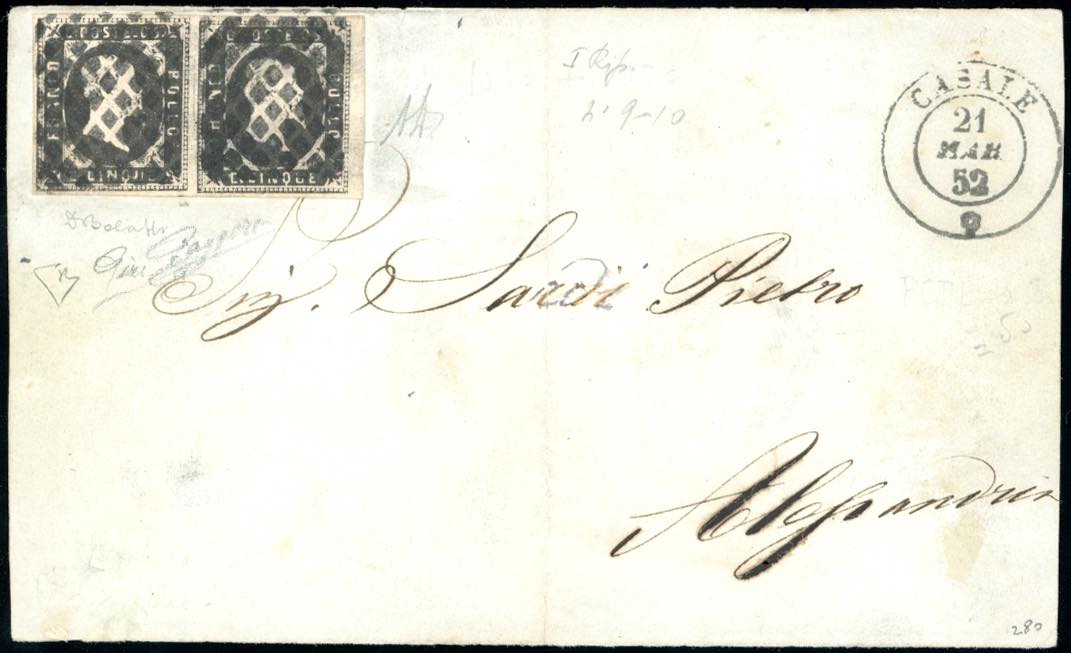 1852 - 5 cent. nero (1), coppia orizzontale, perfetta e ben marginata, su frontespizio di lettera da Casale 21/3/1852 ad Alessandria. ... Read more