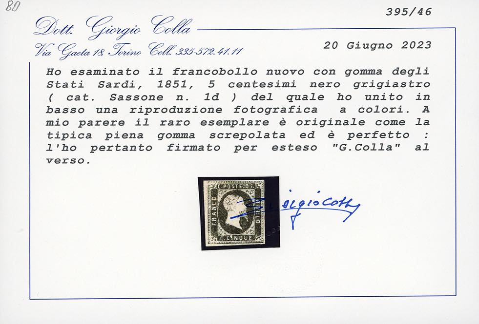 1851 - 5 cent. nero grigiastro (1d), nuovo, gomma originale, lieve traccia di linguella, perfetto. Molto fresco, ampi margini. Raro di questa qualità. Emilio e Alberto Diena, Ferrario, cert. Colla.