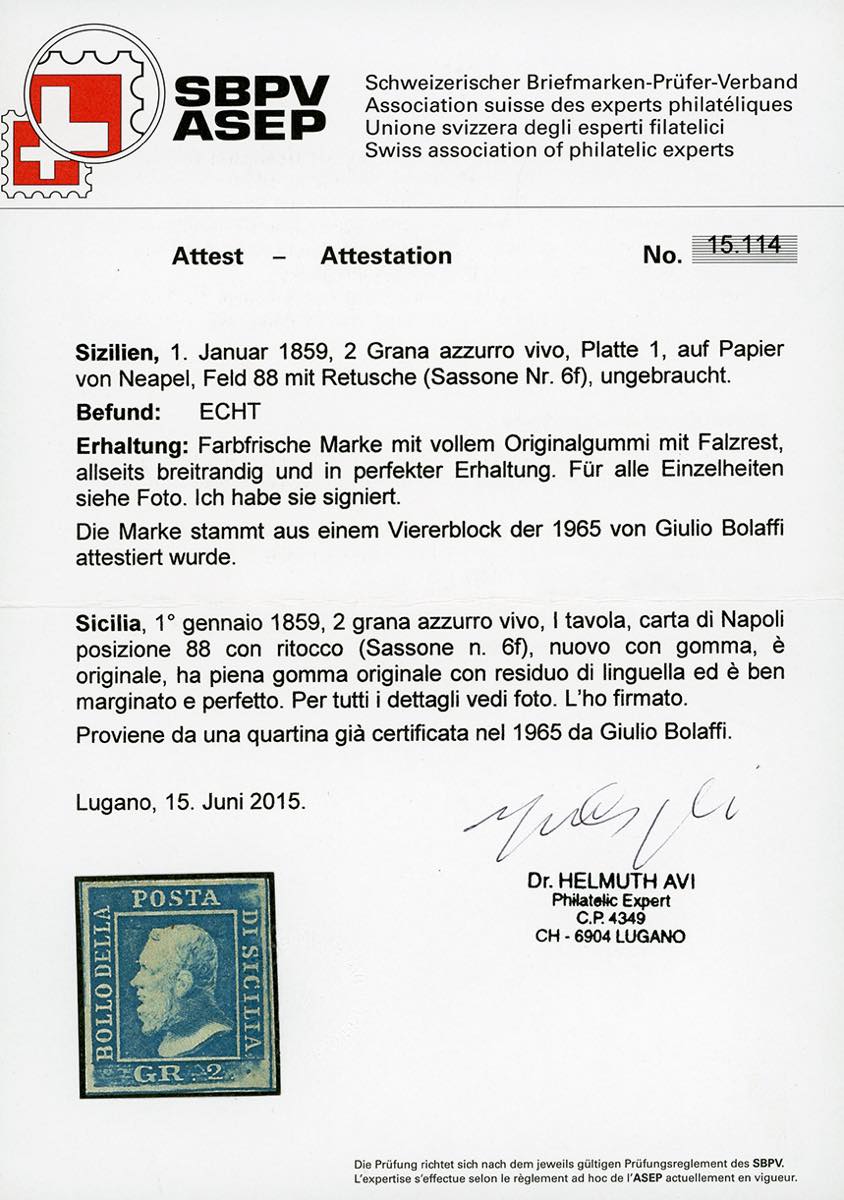 1859 - 2 grana azzurro vivo, I tavola, carta di Napoli, ritocco pos. 88 (6f), gomma originale, perfetto e di ottima qualità. Si tratta probabilmente dell'UNICO ESEMPLARE NUOVO NOTO con queste caratteristiche. A.Diena, Ferrario, cert. Avi. Proviene da un blocco di quattro certificato da G.Bolaffi nel 1965.