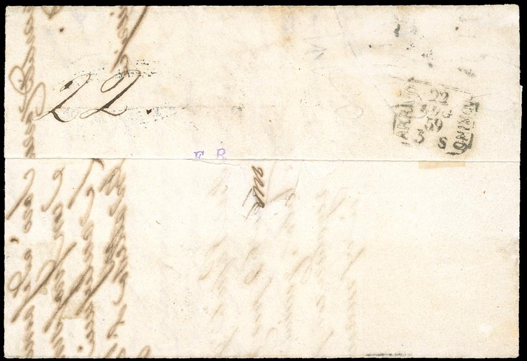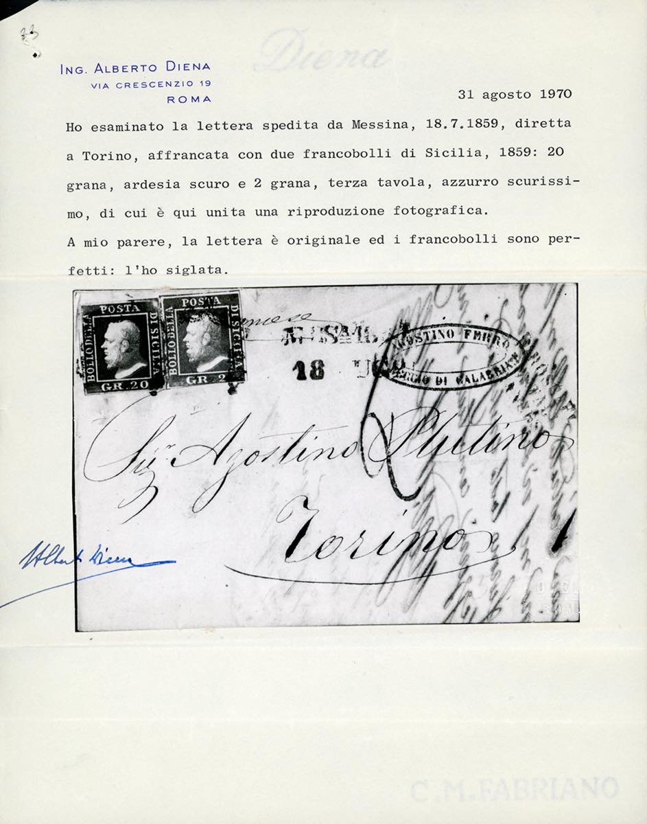 1859 - 20 grana ardesia scuro, perfetto e 2 grana azzurro scurissimo, III tavola, carta di Napoli, appena sfiorato in basso (13c,8a), su fresca lettera scritta a Reggio Calabria, ma affrancata e spedita da Messina 18/7/1859 a Torino, tassata 20 cent. all'arrivo. Molto bella ed interessante forwarded. Chiavarello, cert. Alberto ed Enzo Diena. Ex coll. Imperato.