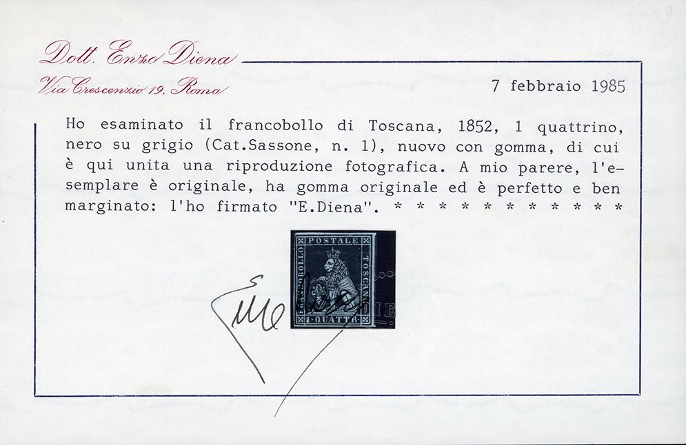 1851 - 1 quattrino nero su grigio (1), nuovo, gomma originale, leggera traccia di linguella, perfetto. Molto raro. Emilio ed Alberto Diena, ... Read more