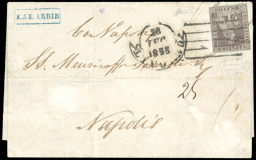 1853 - 9 crazie bruno violaceo su grigio (8), ottimo stato, con evidente impronta di precedente annullo, riutilizzato in frode postale su lettera via di mare da Livorno 28/7/183 a Napoli, tassata 25 grana. Interessante e non comune. Chiavarello, cert. Ferrario. Ex coll. Imperato.