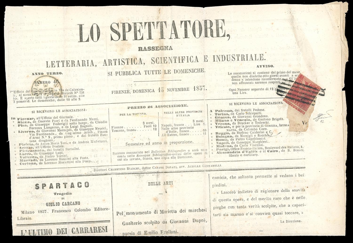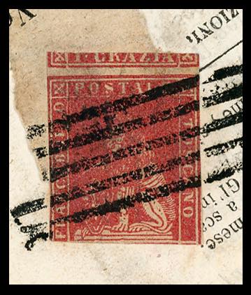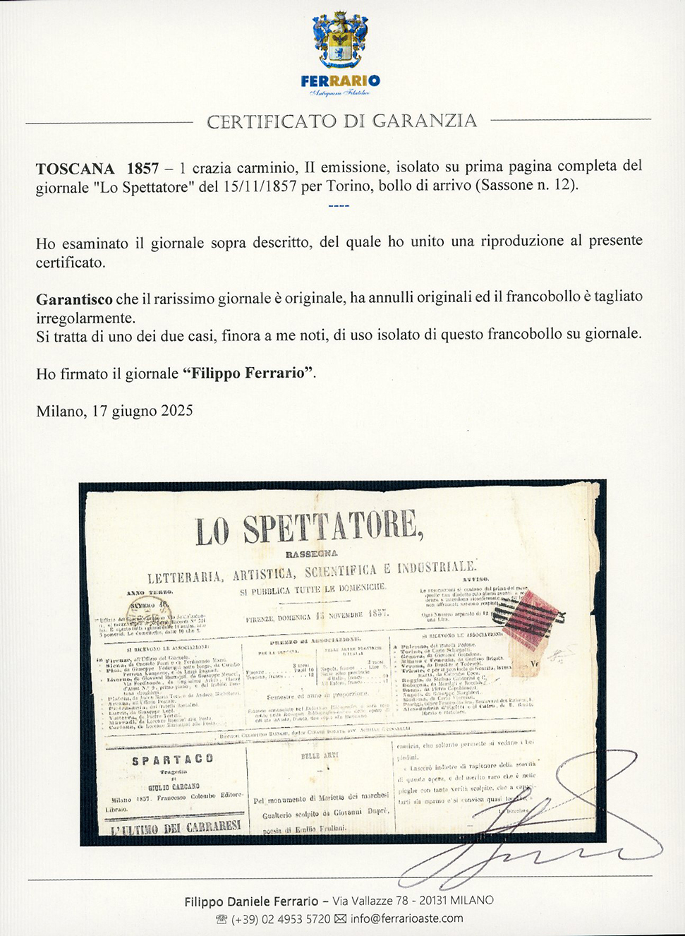 1857 - 1 crazia carminio, II emissione (12), tagliato irregolarmente, tassello del valore in alto, su prima pagina completa del giornale "Lo Spettatore" del 15/11/1857 per Torino, bollo di arrivo. Si tratta probabilmente dell'UNICO ESEMPLARE NOTO su giornale per il Regno di Sardegna. Rarità. Cert. Ferrario (l'1 crazia della II emissione isolato su lettera è quotato € 37.500, mentre non è quotato su giornale).