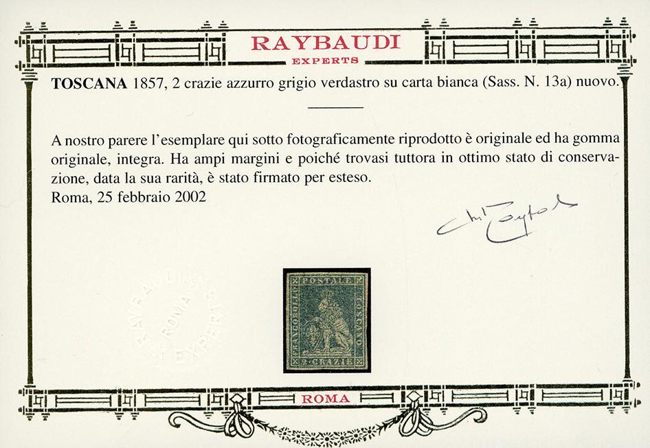 1857 - 2 crazie azzurro grigio verdastro, II emissione, filigrana lettere (13a), nuovo, gomma originale integra, perfetto e con grandi margini. Splendido e raro in queste condizioni. Cert. Oro Raybaudi.