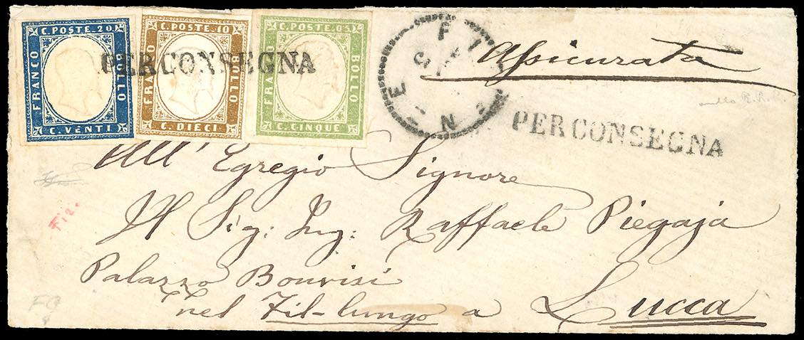 FIRENZE, cerchio con contorno di punti + per consegna unico annullatore punti R1 - 5 cent., 10 cent. e 20 cent. IV emissione di Sardegna (13Ca,14Ci,15Dc), perfetti ad eccezione del 10 cent. che ha il margine sinistro sfiorato, su busta raccomandata per Lucca 21/11/1861. Raro annullo, specie in abbinamento al datario con contorno di punti. Cert. Ferrario.