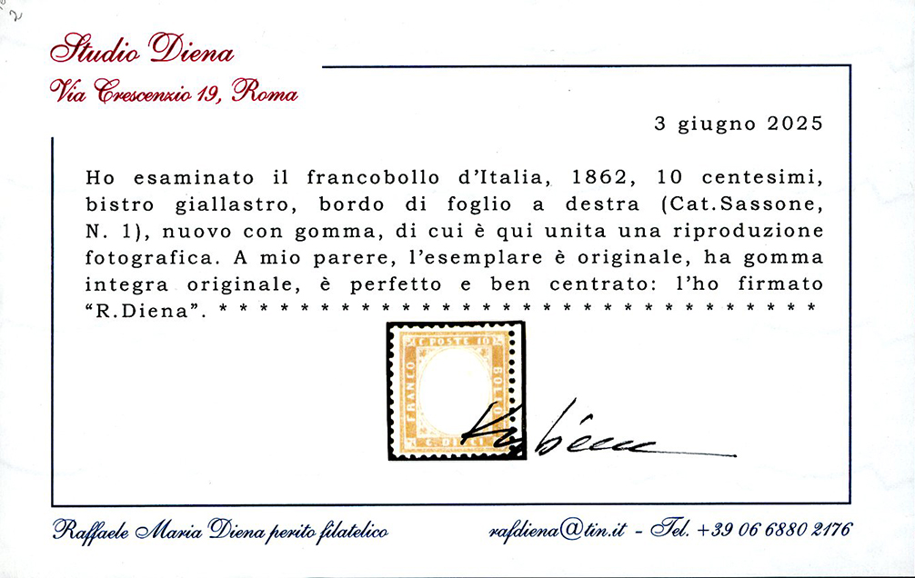1862 - 10 cent. bistro giallastro (1), bordo di foglio a destra, buona centratura, nuovo, gomma originale integra, perfetto. Molto fresco e di ottima qualità. Sirotti, A.Diena, cert. R.Diena.