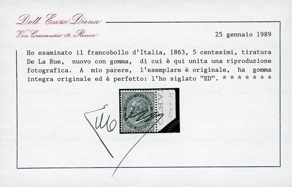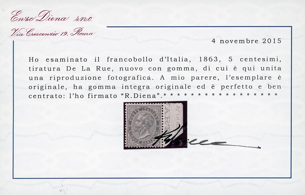 1863 - 5 cent. De La Rue, tiratura di Londra (L16), discreta centratura, bordo di folio, nuovo, gomma originale integra, perfetto. Em. Ed A.Diena, cert. Enzo e Raffaele Diena.