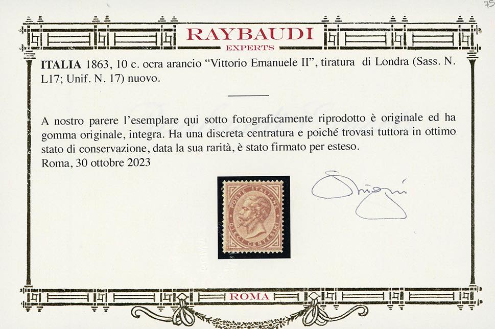 1863 - 10 cent. De La Rue, tiratura di Londra (L17), discreta centratura, nuovo, gomma originale integra, perfetto e molto fresco. Colla, cert. Oro Raybaudi e Ferrario.