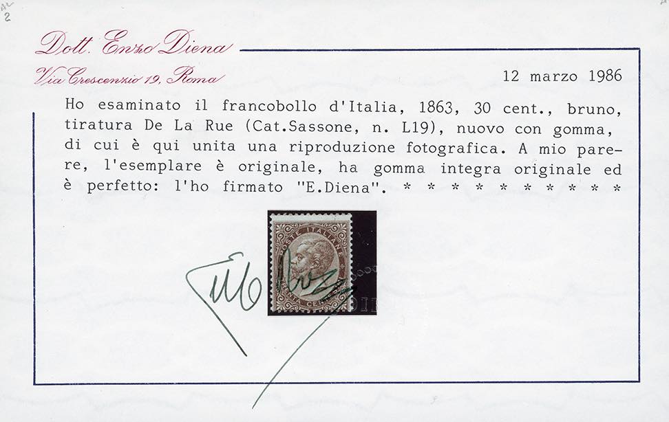 1863 - 30 cent. bruno, De La Rue, tiratura di Londra (L19), nuovo, gomma originale integra, perfetto, molto fresco. G.Oliva, Giulio Bolaffi ... Read more
