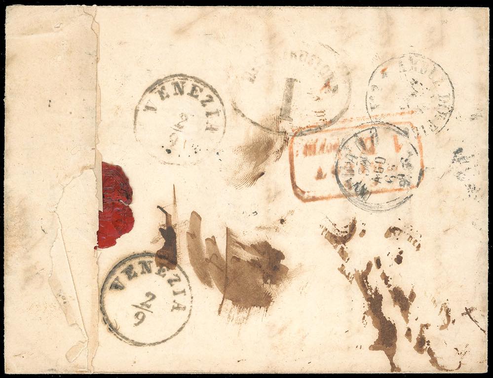 1865 - 20 cent. su 15 cent. Ferro di cavallo, II tipo (24), un angolo arrotondato, su lettera da Siena 29/8/1865 a Trieste, rispedita a Venezia, sul fronte numerosi bolli tra cui due "insufficiente" di foggia diversa e "credito italiano cent." e "debito italiano cent." Interessante.